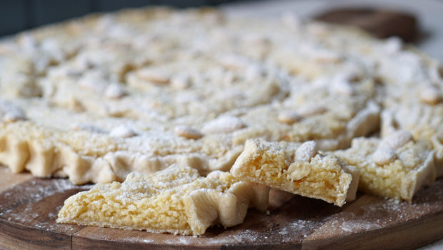Preostalo tijesto sjedinite pa izvaljajte na tanko kao za rezance. Kotačićem izrežite trake širine oko 2 cm. Svaku ukrasnu traku zupčasto nabirite prstima i pritišćite, odnosno lijepite za podlogu i uz rub nadjeva sve okolo naokolo. Tortu dodatno ukrasite cijelim bademima.